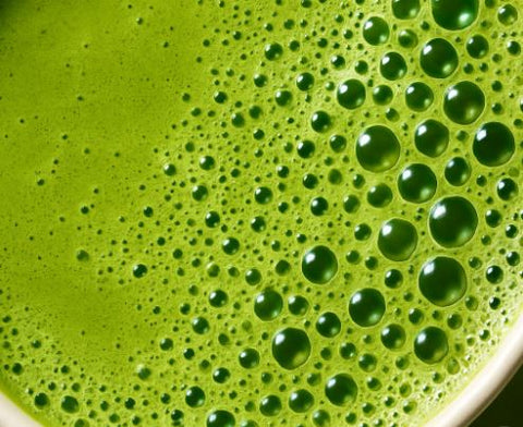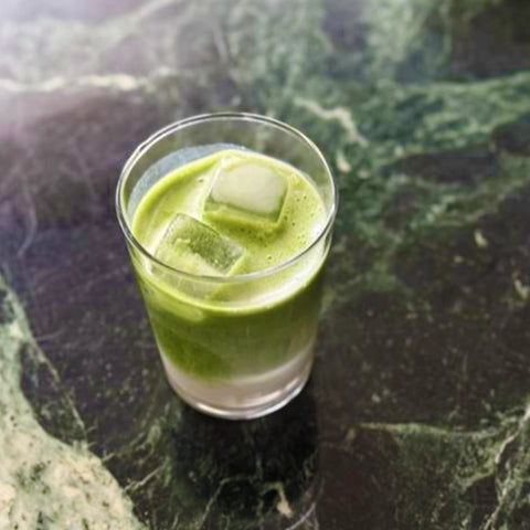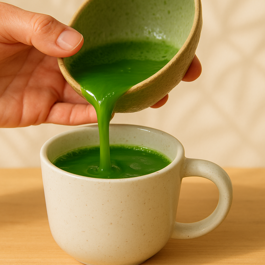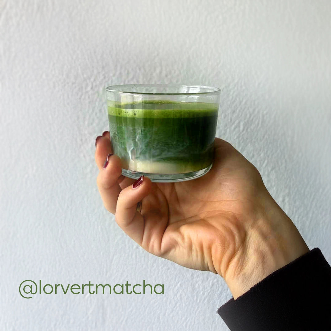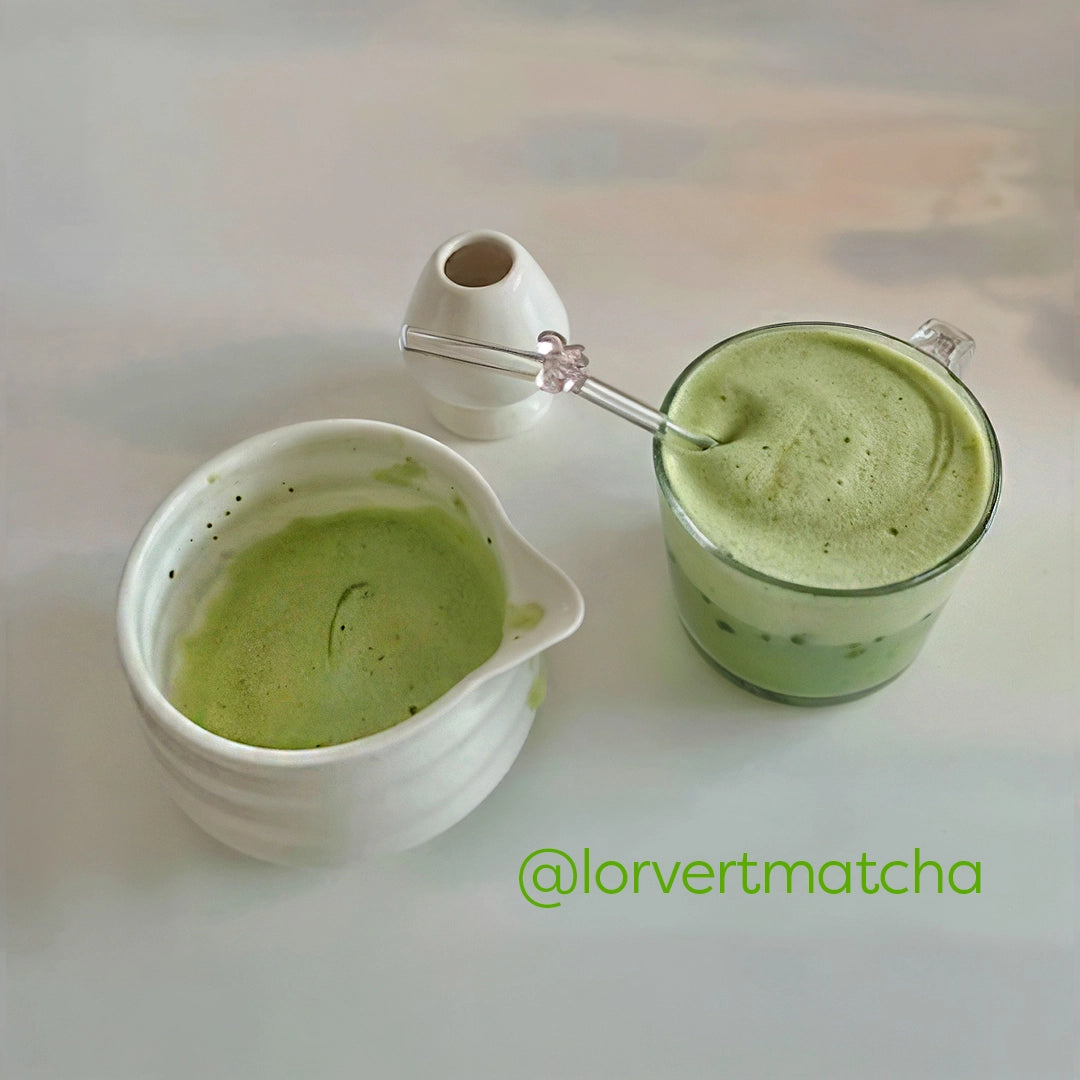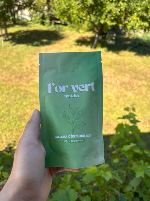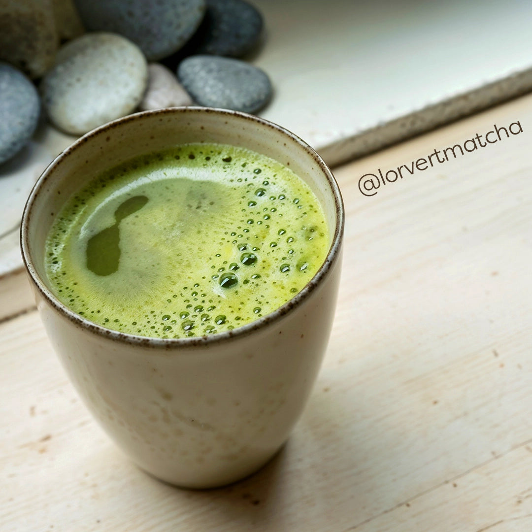À gauche : notre matcha pur, vibrant, issu de la première récolte et broyé à la meule de pierre.